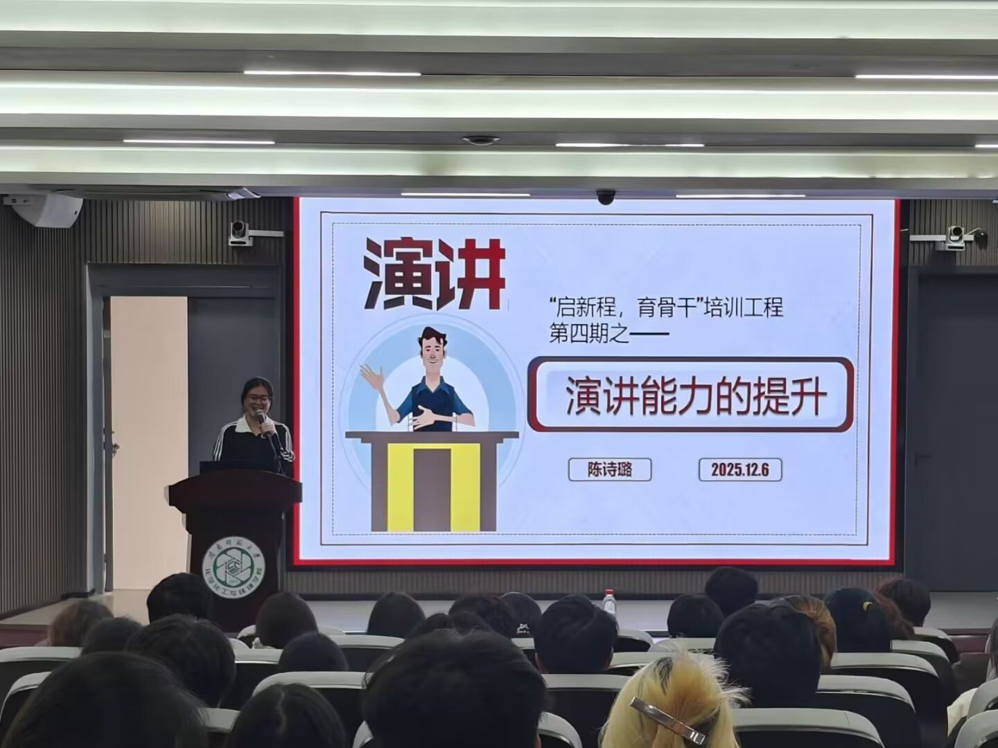 12月6日,第四期培训在达理楼南区206开展,聚焦学生干部实用技能,切实推动骨干能力从理论认知向实操运用转化。我院就业创业服务中心主任章鑫讲解PPT制作技巧,为学员提供兼具理论深度和实践可行性的制作指南;大学生创新创业大赛二十佳项目主讲人陈诗璐分享演讲能力提升方法,将“会说话”转化为可练习的技能;“绿盾锦袍”团队成员张龙泉分享竞赛经验,点明精准表达与高效沟通对学生工作和个人发展的重要意义。本期培训通过多项技能干货,助力学员夯实基础、提升实效。